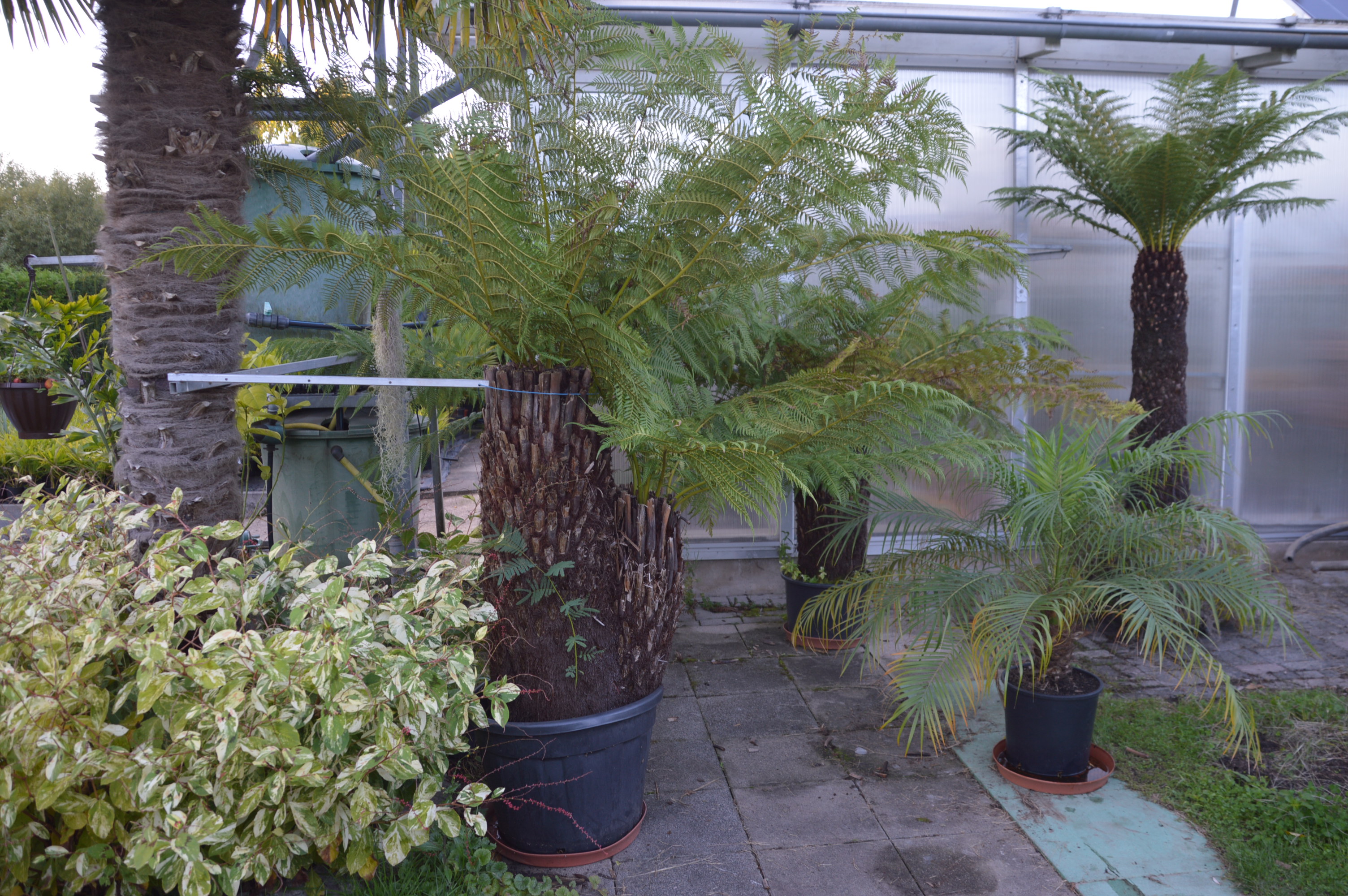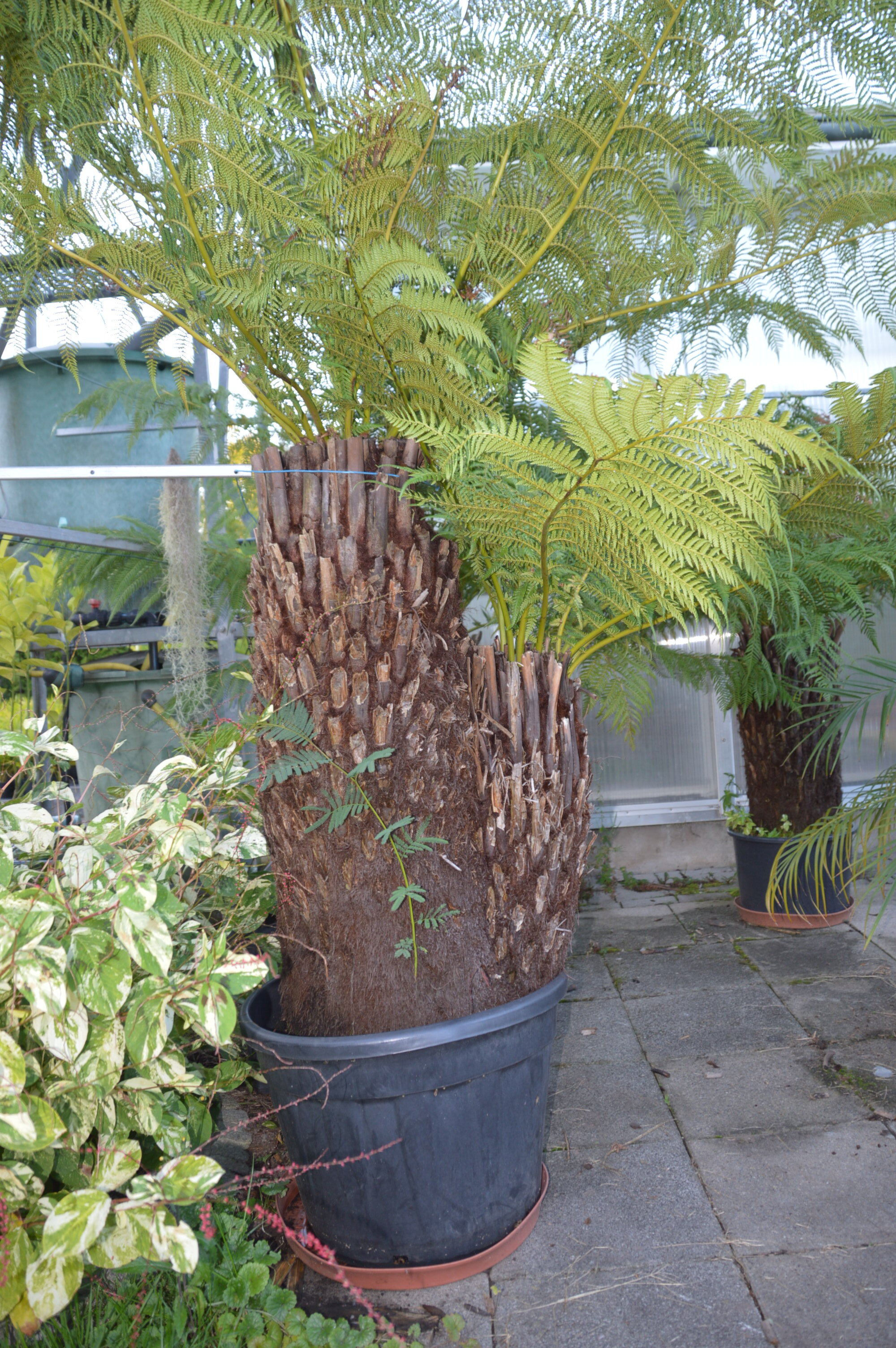 Sein bulliger Stamm beträgt ca. 1,20 m, besteht aus 2 Farnen, was eine sehr große Rarität ist in guter Qualität ist. Diese Seltenheit ist sehr begehrt. Diese Rarität an Stämmen gibt es sehr wenige, die Natur lässt nicht oft zu, dass sich 2 Stämme vereinen und zu einer gewaltigen Einheit zusammenwachsen. Zwei wuchtige Kronen, viele Fieder. Diese Seltenheit ist getopft. Hier hat man also gleich zwei Farne mit vielen Fiedern. Gesamthöhe mit Fieder ca. 3 m.